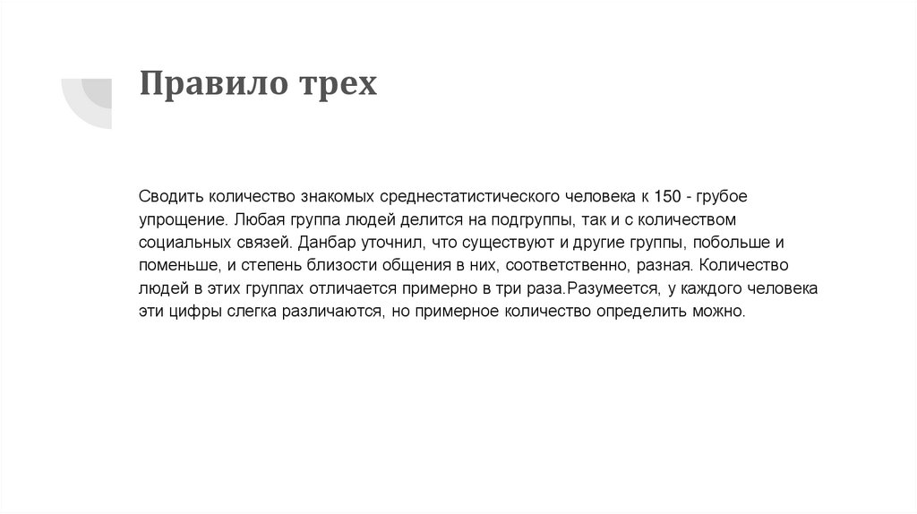 Правило трехСводить количество знакомых среднестатистического человека к 150 - грубое
