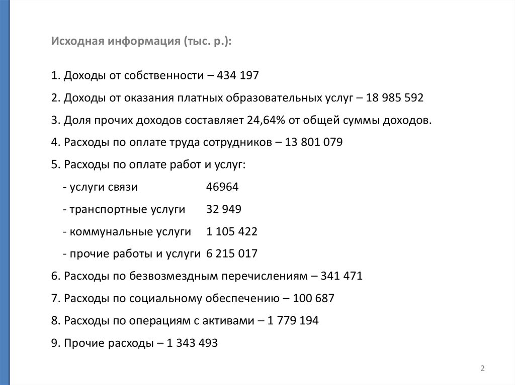 Исходная информация (тыс. р.):1. Доходы от собственности – 434 197