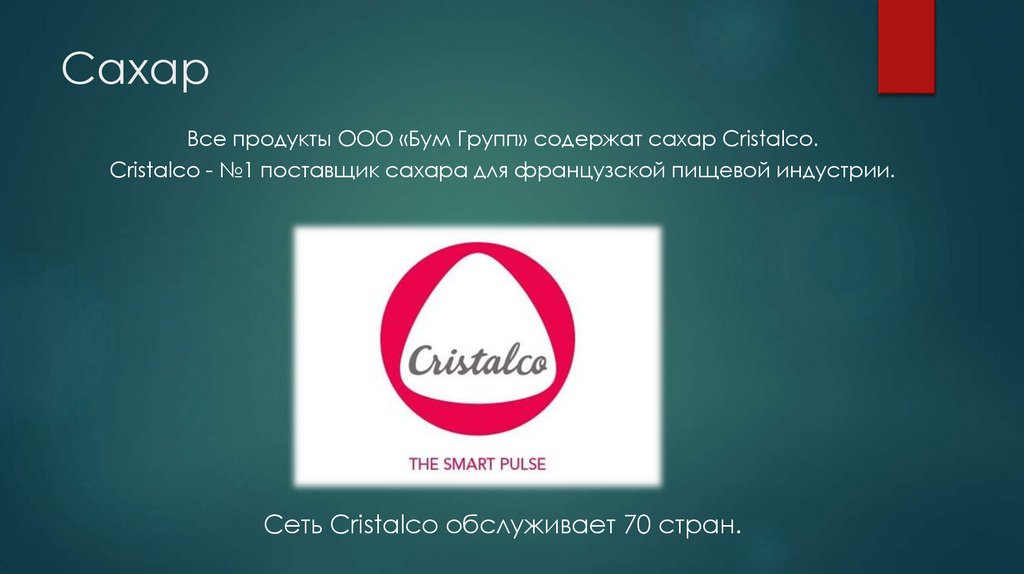 СахарВсе продукты ООО «Бум Групп» содержат сахар Cristalco.
