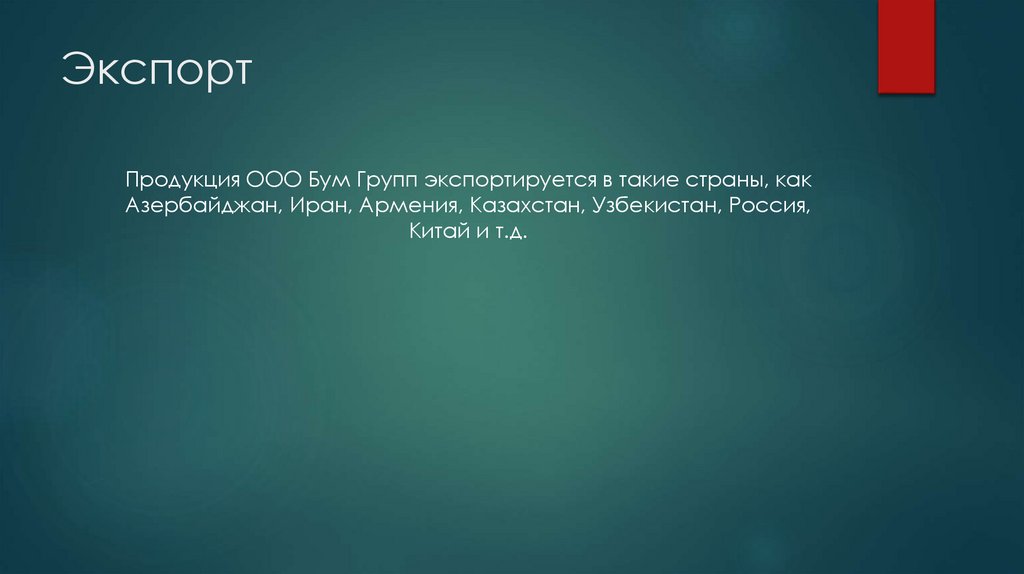 ЭкспортПродукция ООО Бум Групп экспортируется в такие страны, как