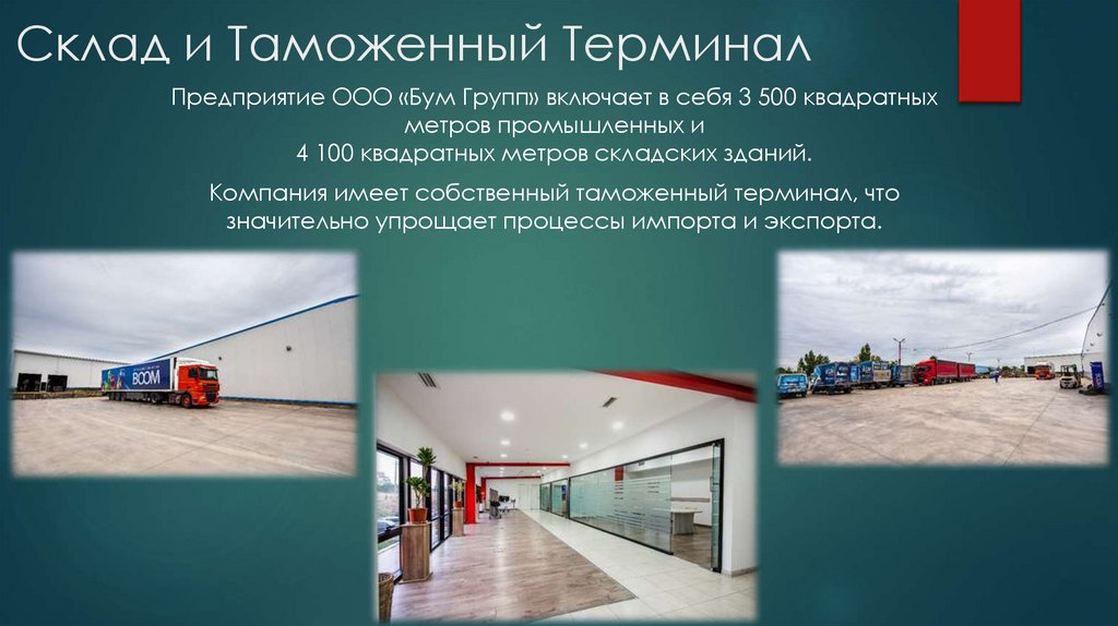 Склад и Таможенный ТерминалПредприятие ООО «Бум Групп» включает в себя 3 500 квадратных