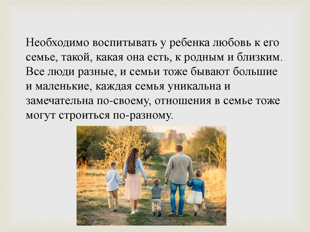 Необходимо воспитывать у ребенка любовь к егосемье, такой, какая она есть, к родным и близким.