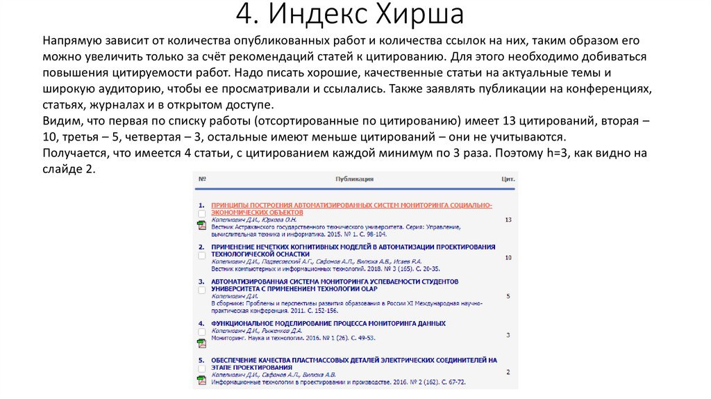 4. Индекс ХиршаНапрямую зависит от количества опубликованных работ и количества ссылок на них, таким образом его