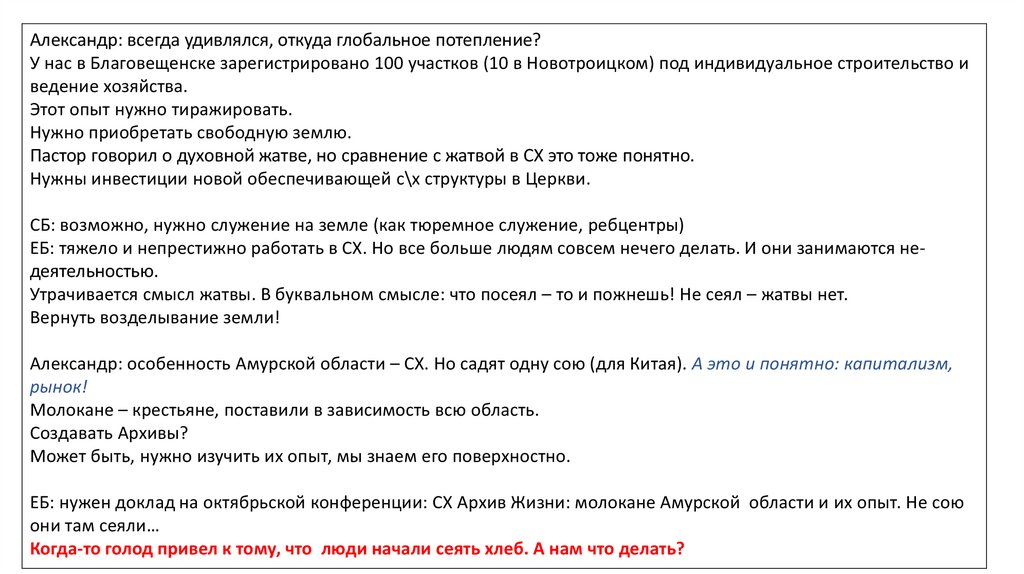 ЕБ: нужен доклад на октябрьской конференции: СХ Архив Жизни: молокане Амурской области и их опыт. Не сою