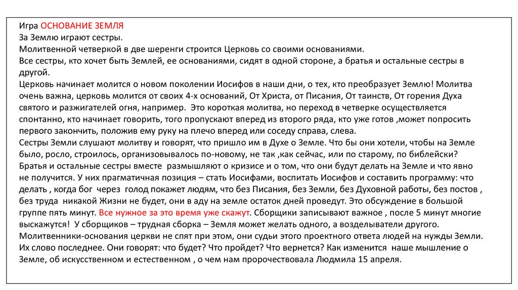 ЕБ: Возможно нас продвинет «Игра в Основание – Земля». Земля оказалась для нас безвидна и пуста…Мы