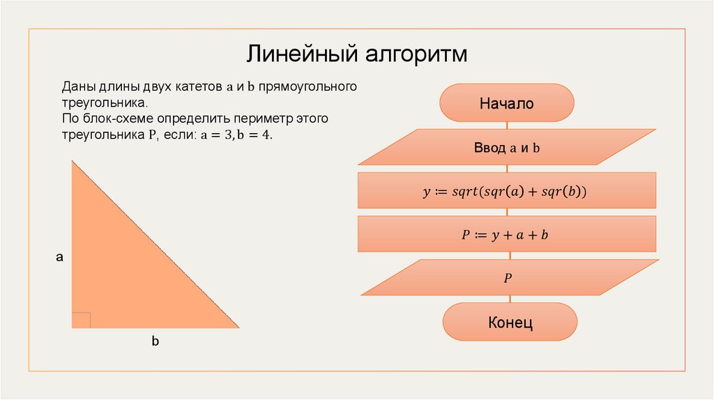 Линейный алгоритмДаны длины двух катетов а и b прямоугольного
