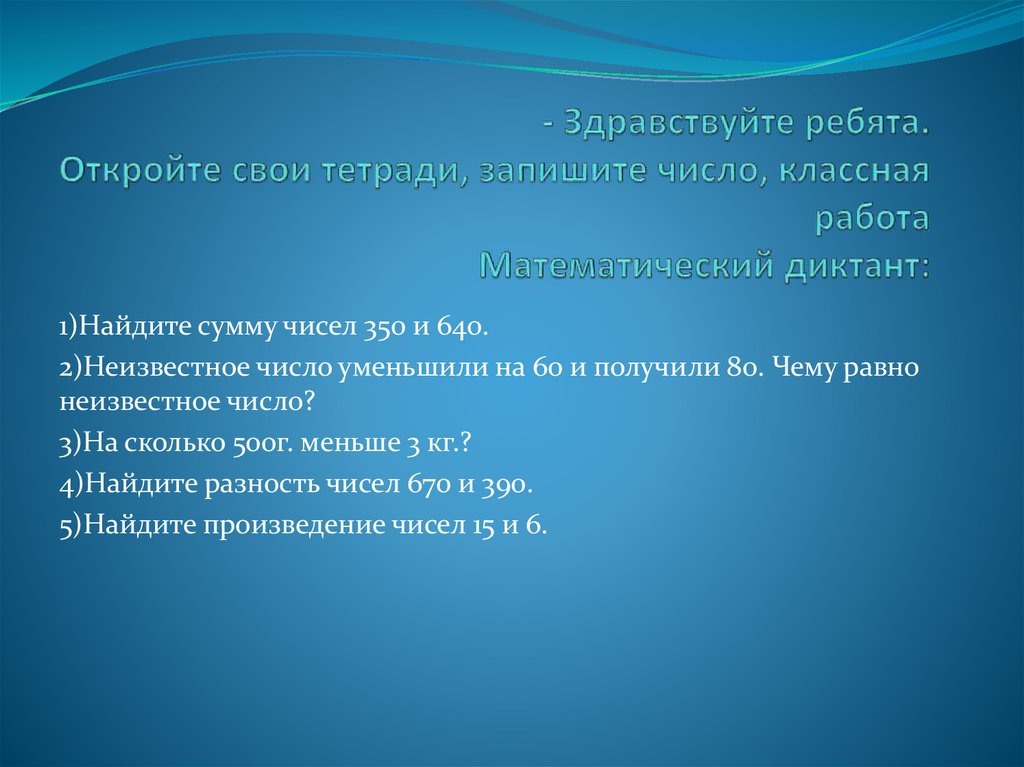 1)Найдите сумму чисел 350 и 640.2)Неизвестное число уменьшили на 60 и получили 80. Чему равно