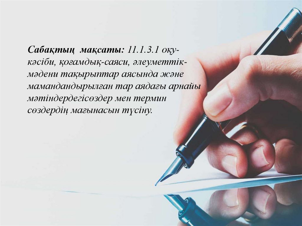 Сабақтың мақсаты: 11.1.3.1 оқукәсіби, қоғамдық-саяси, әлеуметтікмәдени тақырыптар аясында жәнемамандандырылған тар аядағы арнайы