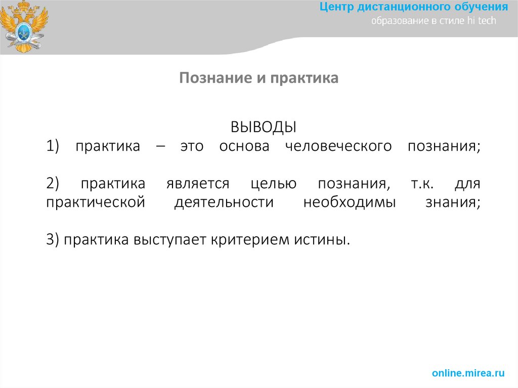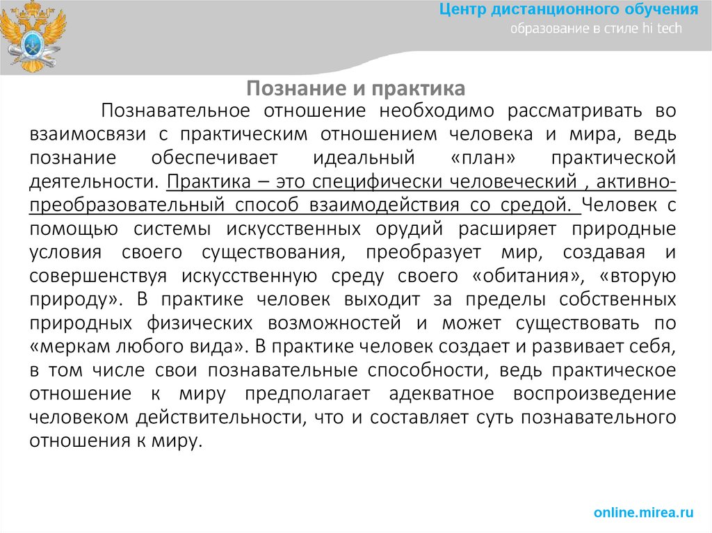 деятельности. Практика – это специфически человеческий , активнопреобразовательный способ взаимодействия со средой. Человек с