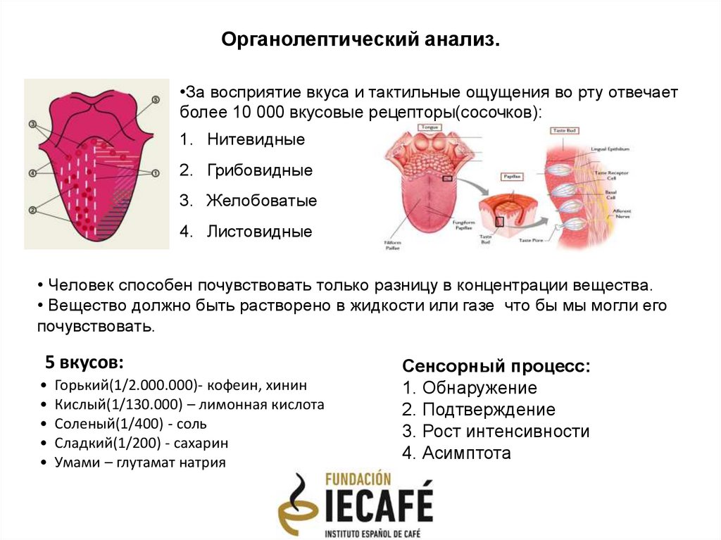 Органолептический анализ.•За восприятие вкуса и тактильные ощущения во рту отвечает