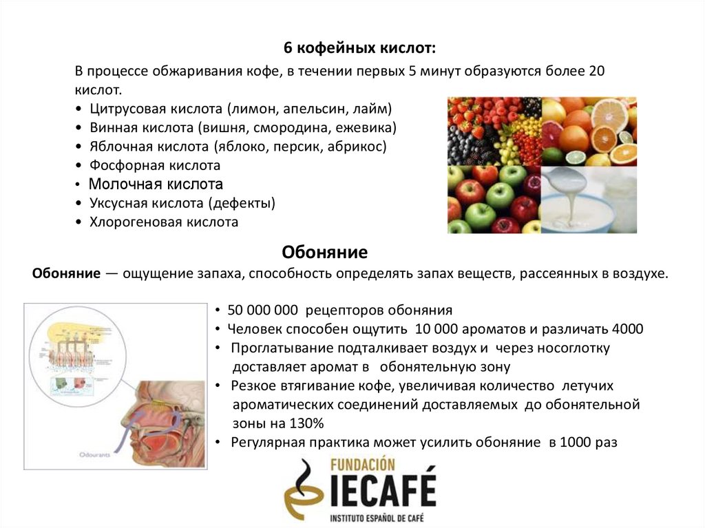 6 кофейных кислот:В процессе обжаривания кофе, в течении первых 5 минут образуются более 20