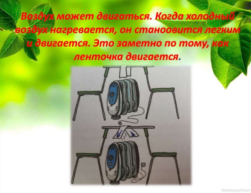Воздух может двигаться. Когда холодныйвоздух нагревается, он станоовится легким