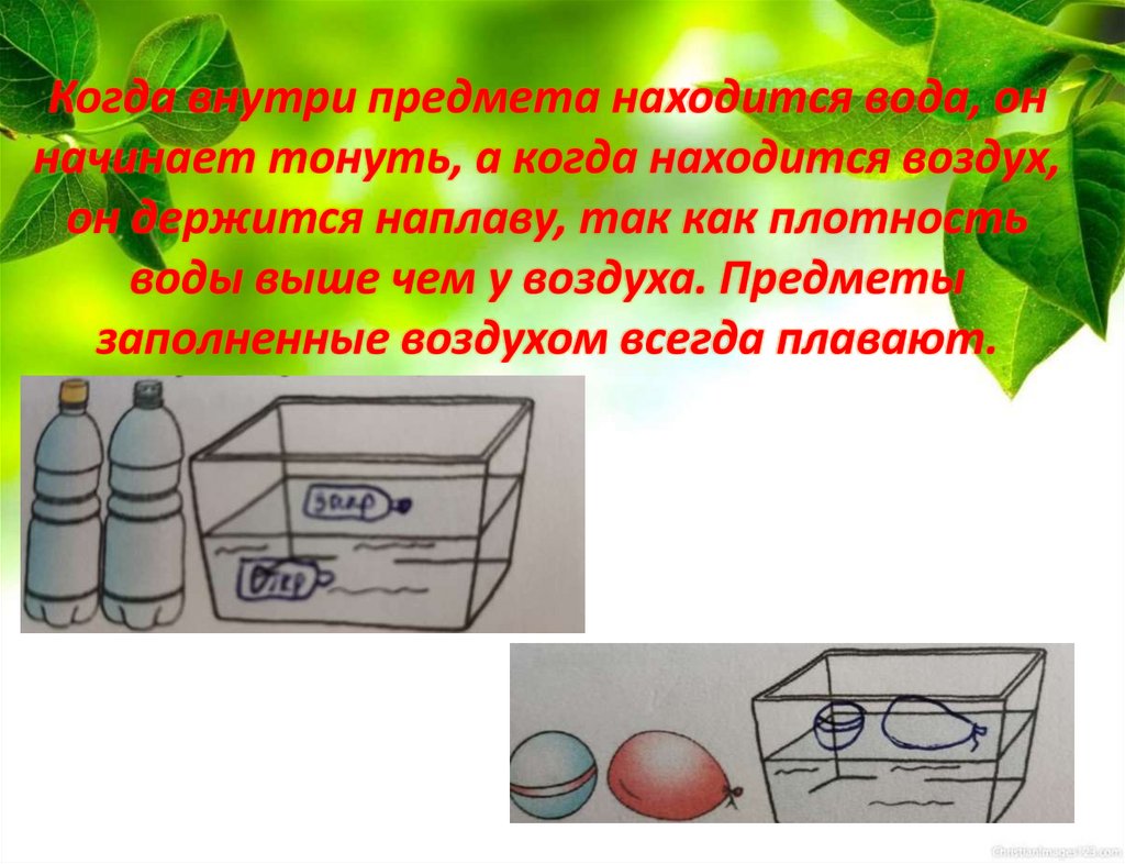 Когда внутри предмета находится вода, онначинает тонуть, а когда находится воздух,