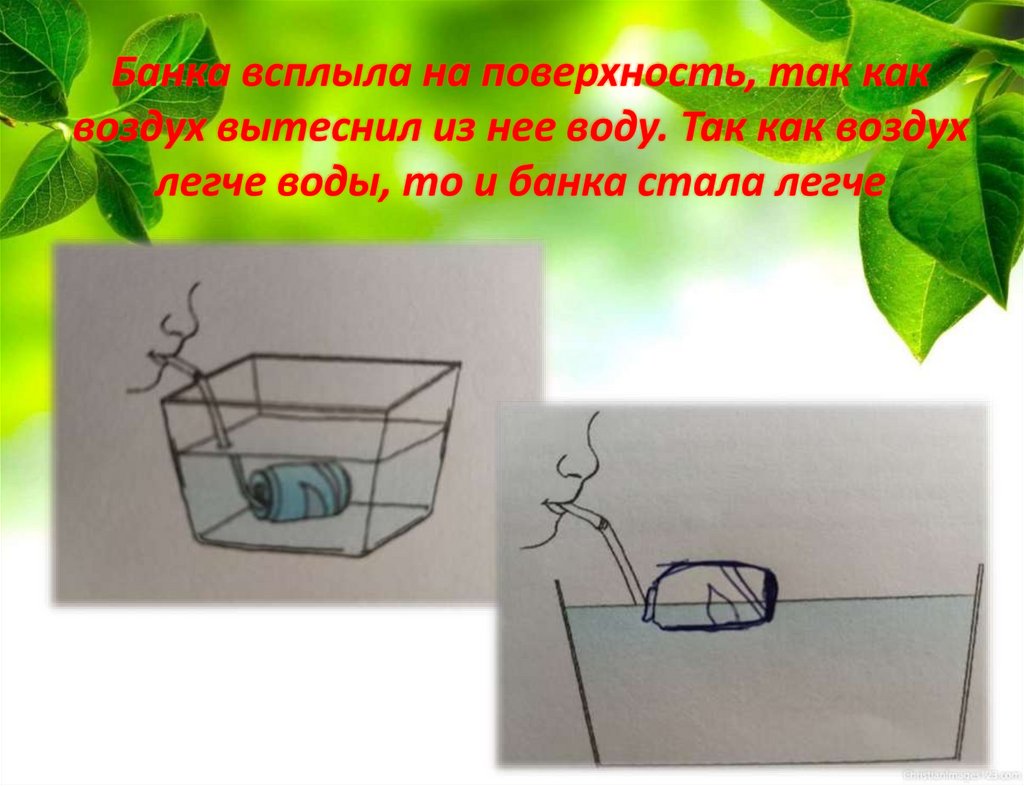 Банка всплыла на поверхность, так каквоздух вытеснил из нее воду. Так как воздух