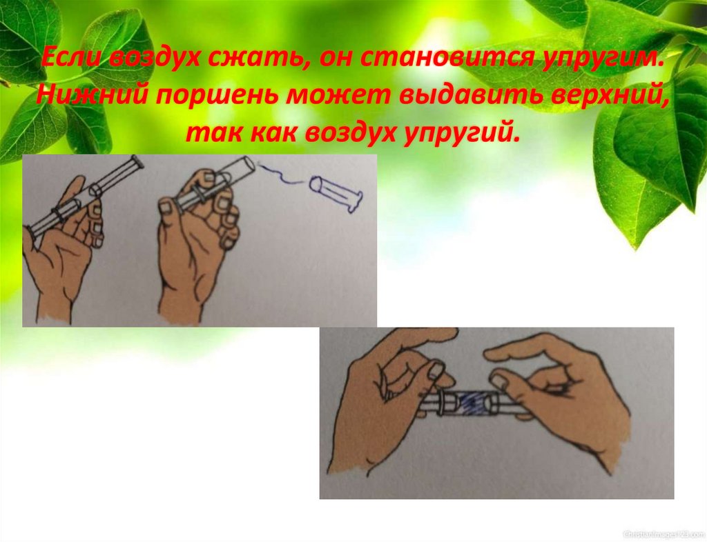 Если воздух сжать, он становится упругим.Нижний поршень может выдавить верхний,