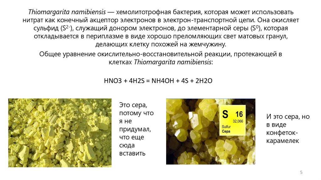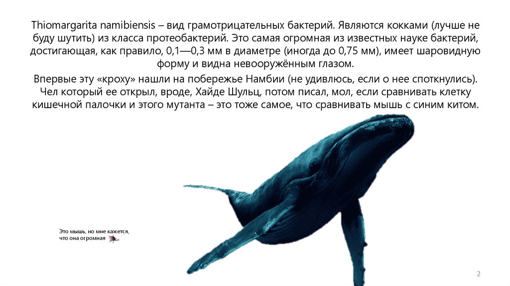 Thiomargarita namibiensis – вид грамотрицательных бактерий. Являются кокками (лучше небуду шутить) из класса протеобактерий. Это самая огромная из известных науке бактерий,