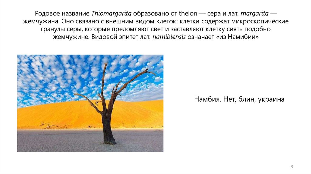 Родовое название Thiomargarita образовано от theion — сера и лат. margarita —жемчужина. Оно связано с внешним видом клеток: клетки содержат микроскопические