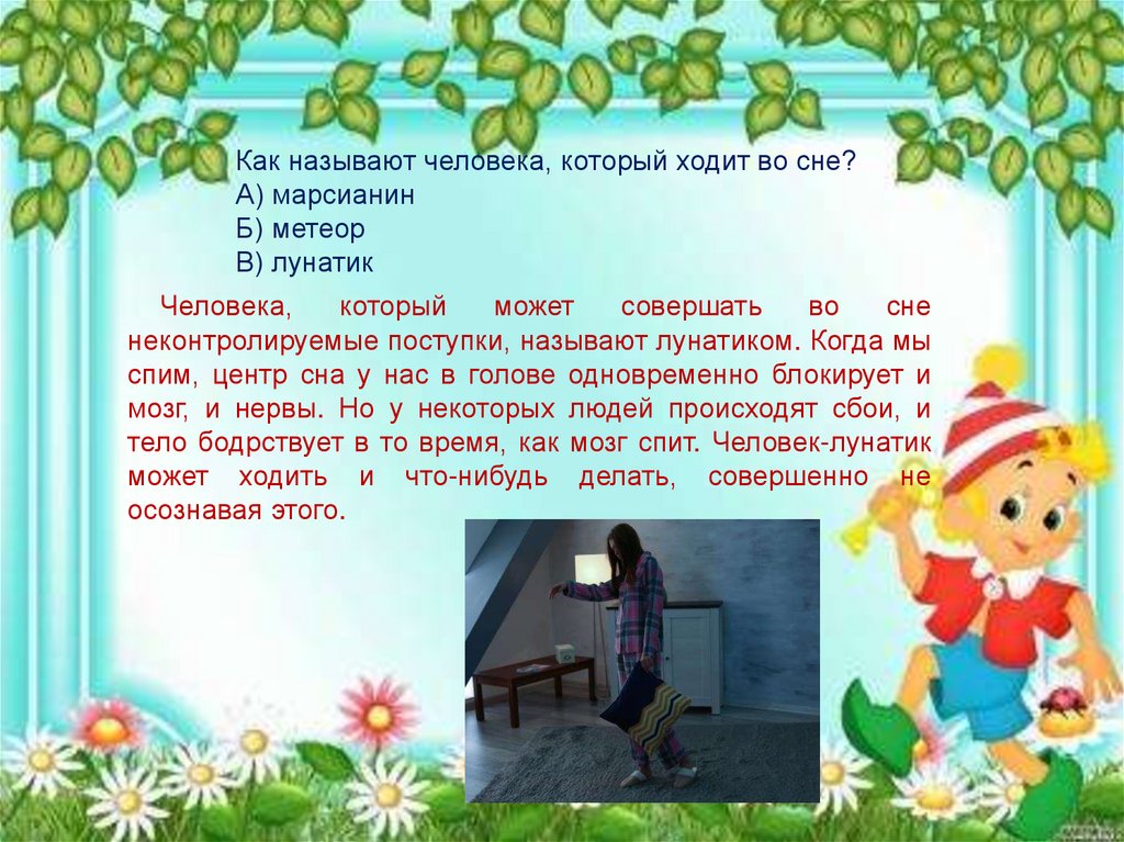 Как называют человека, который ходит во сне?А) марсианин