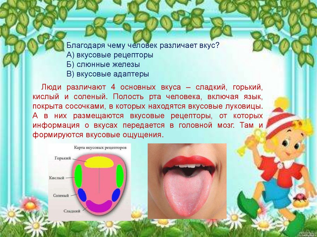 Благодаря чему человек различает вкус?А) вкусовые рецепторы