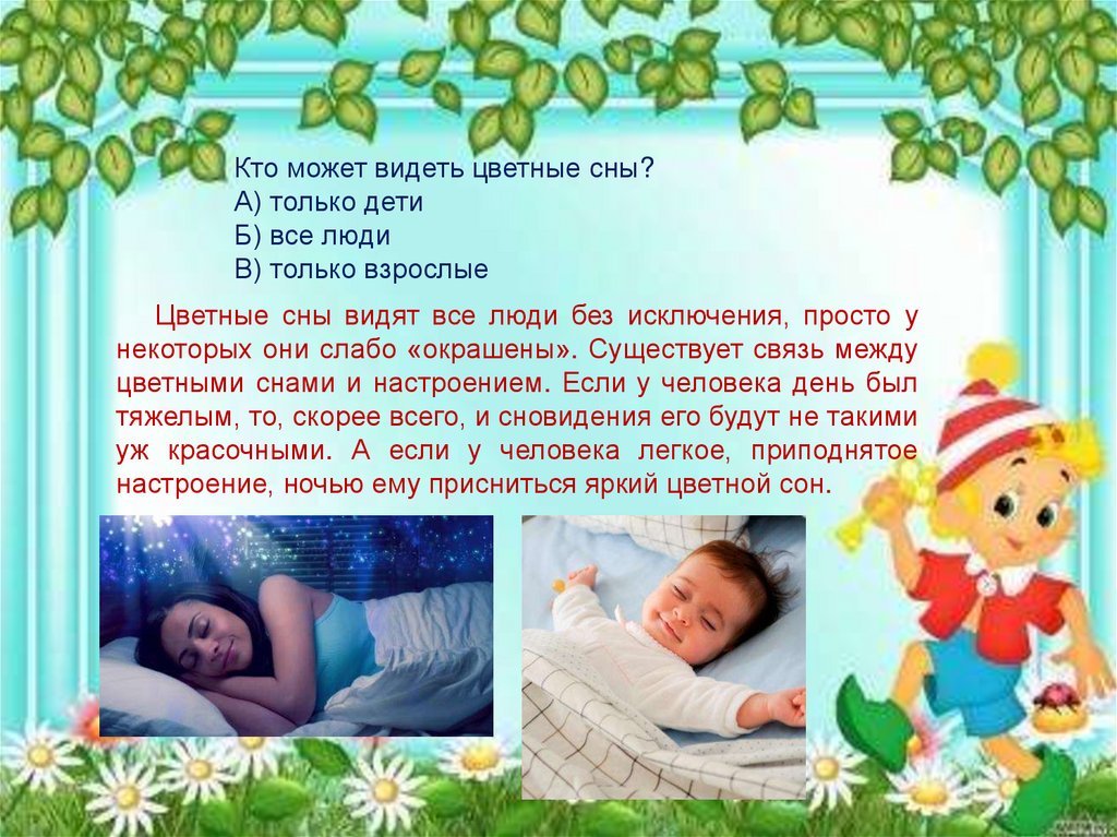Кто может видеть цветные сны?А) только дети