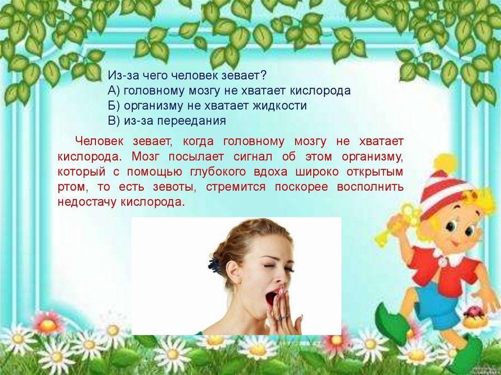Из-за чего человек зевает?А) головному мозгу не хватает кислорода