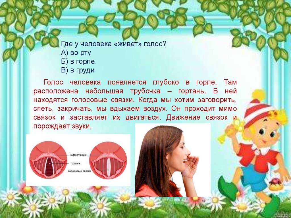 Где у человека «живет» голос?А) во рту