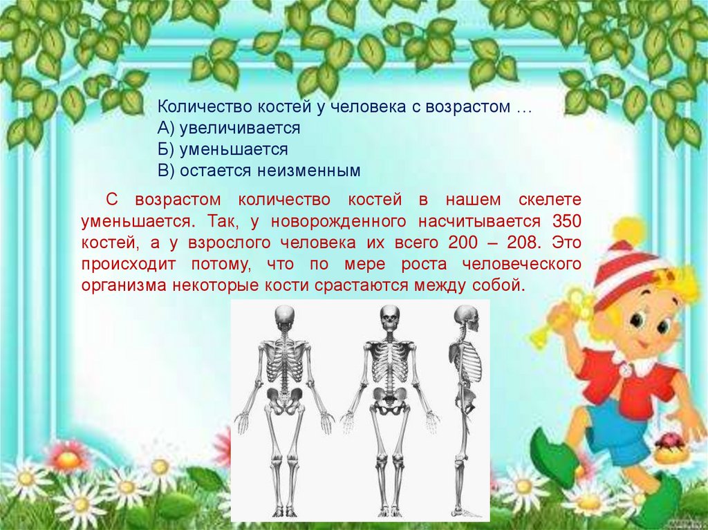 Количество костей у человека с возрастом …А) увеличивается