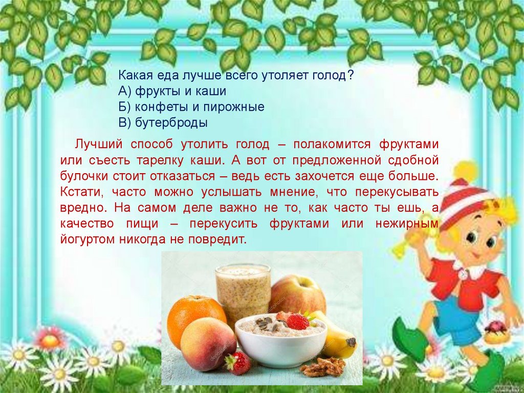 Какая еда лучше всего утоляет голод?А) фрукты и каши