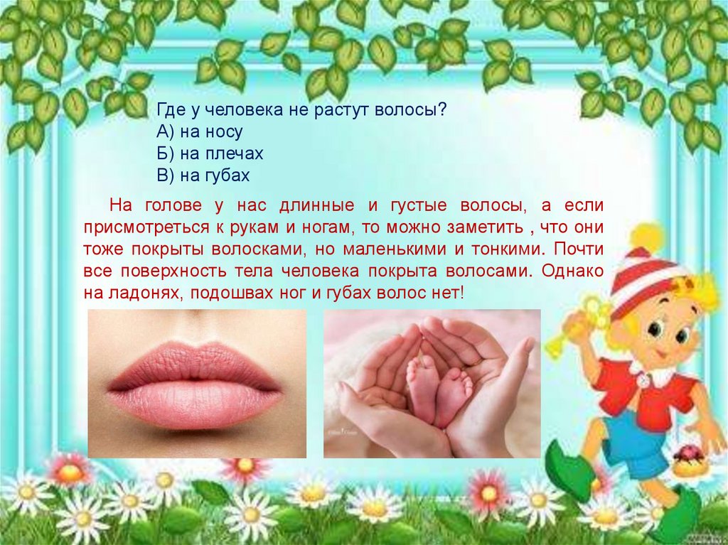 Где у человека не растут волосы?А) на носу