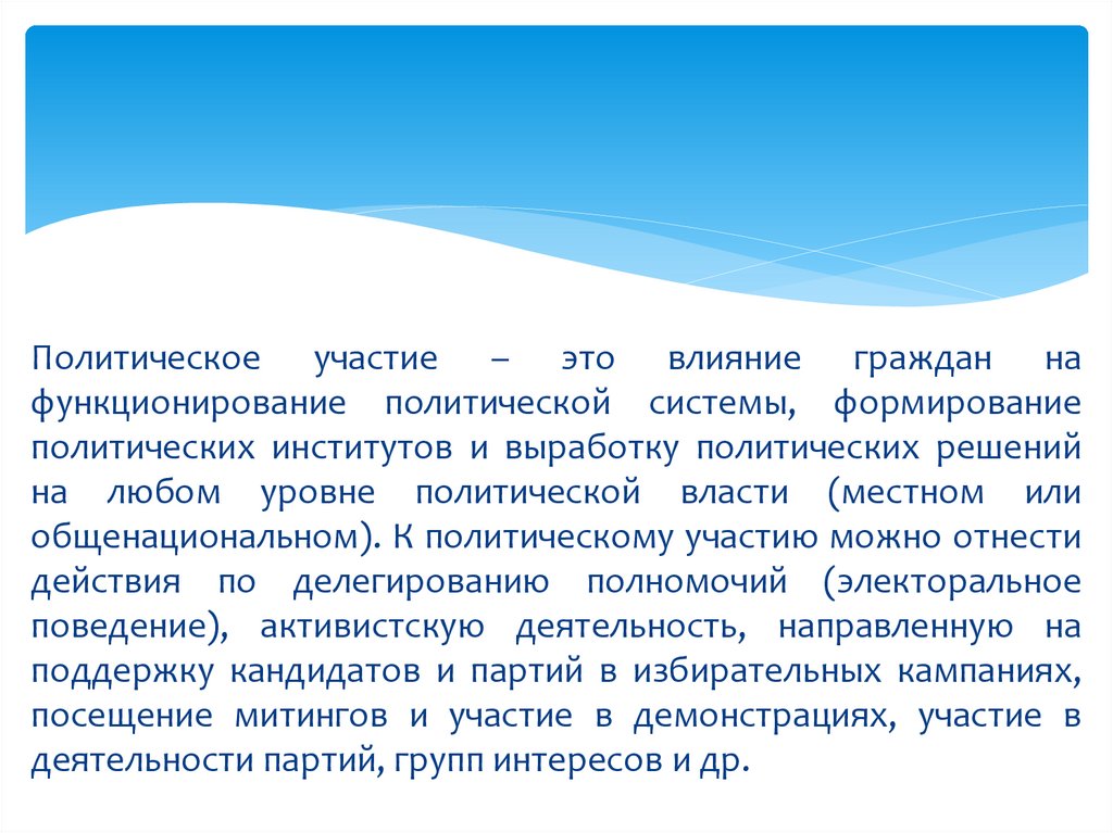 Политическое участие – это влияние граждан нафункционирование политической системы, формирование