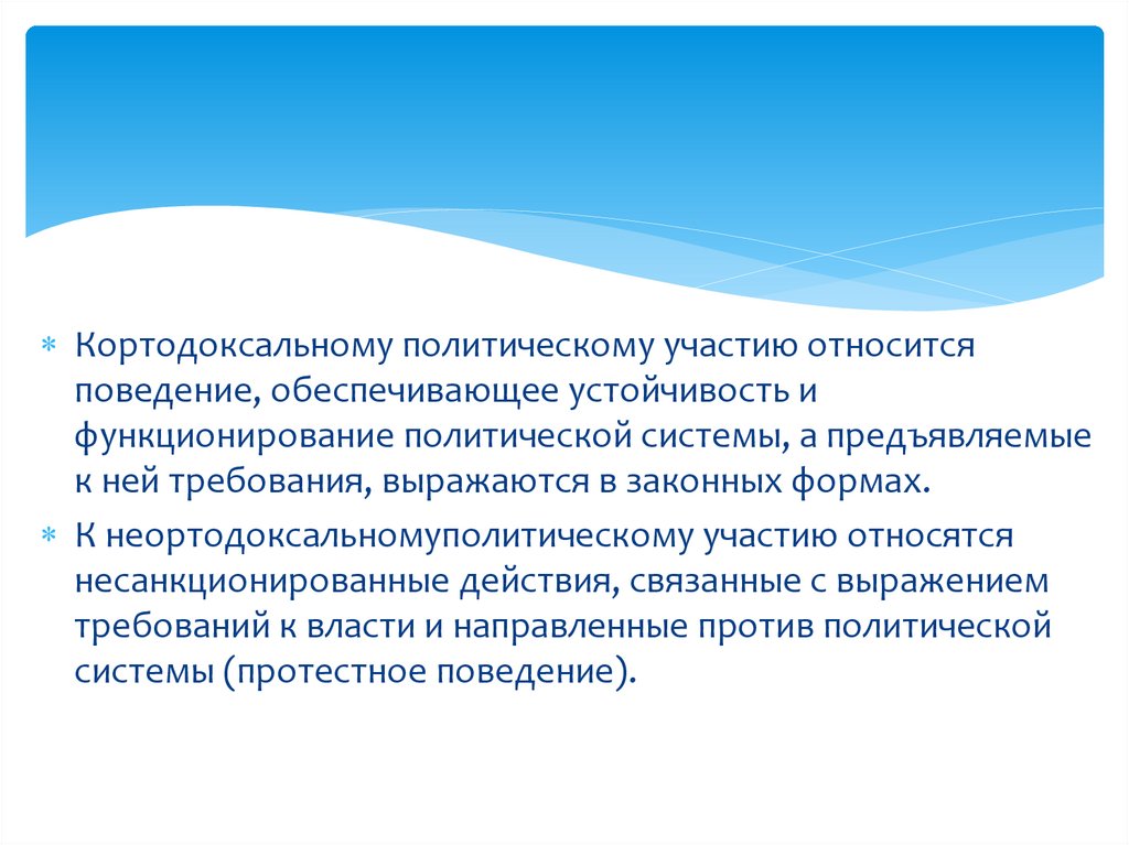 Кортодоксальному политическому участию относитсяповедение, обеспечивающее устойчивость и