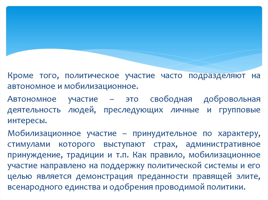 Кроме того, политическое участие часто подразделяют наавтономное и мобилизационное.