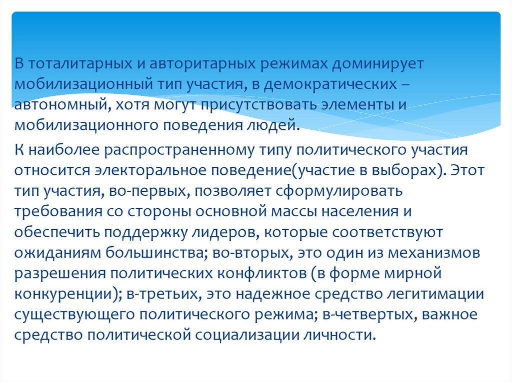 В тоталитарных и авторитарных режимах доминируетмобилизационный тип участия, в демократических –