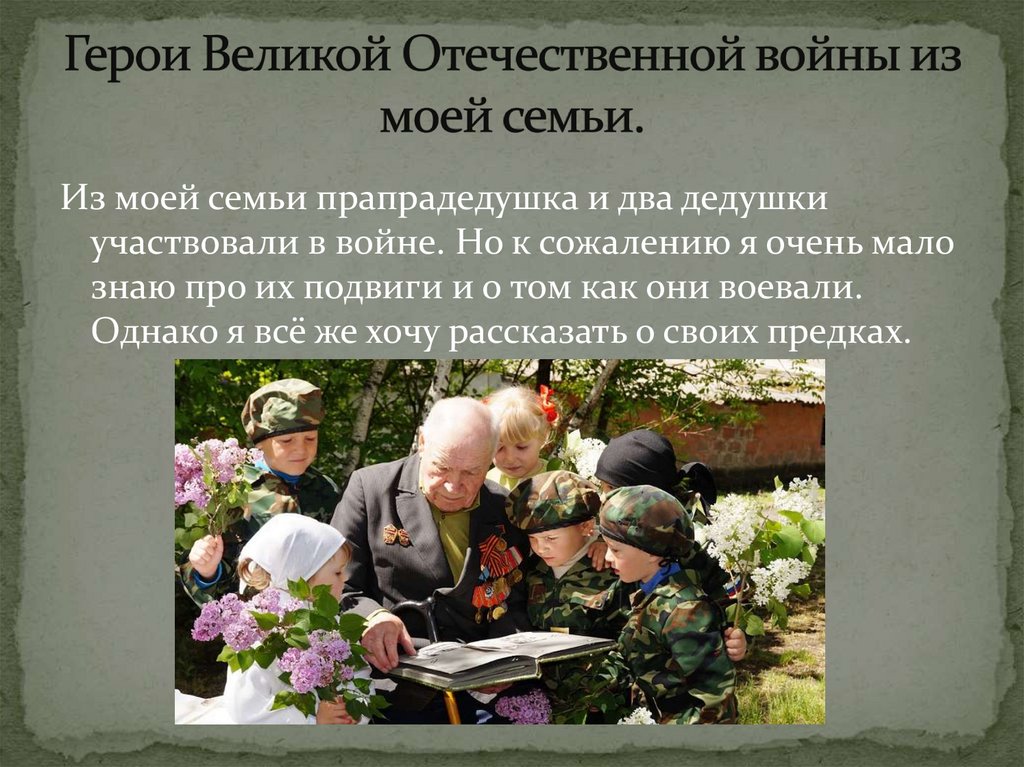 Из моей семьи прапрадедушка и два дедушкиучаствовали в войне. Но к сожалению я очень мало