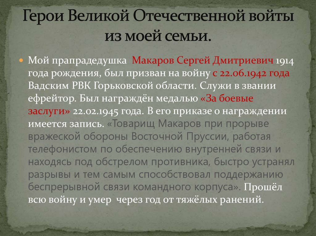 Мой прапрадедушка Макаров Сергей Дмитриевич 1914года рождения, был призван на войну с 22.06.1942 года
