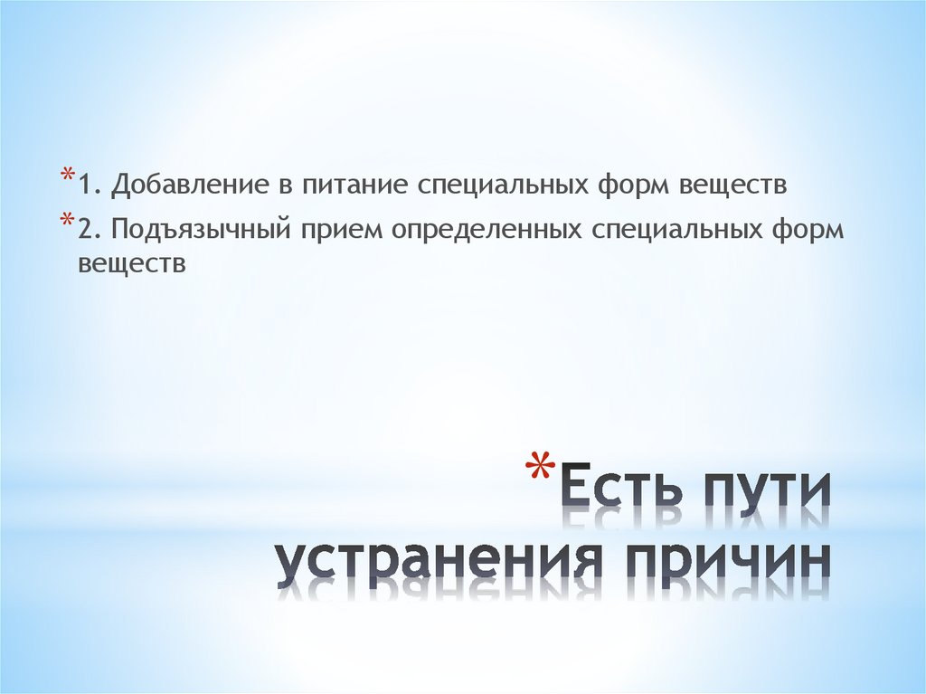 * 1. Добавление в питание специальных форм веществ* 2. Подъязычный прием определенных специальных форм
