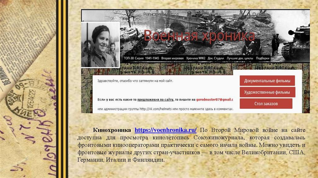Кинохроника https://voenhronika.ru/ По Второй Мировой войне на сайтедоступна для просмотра кинолетопись Союзкиножурнала, которая создавалась