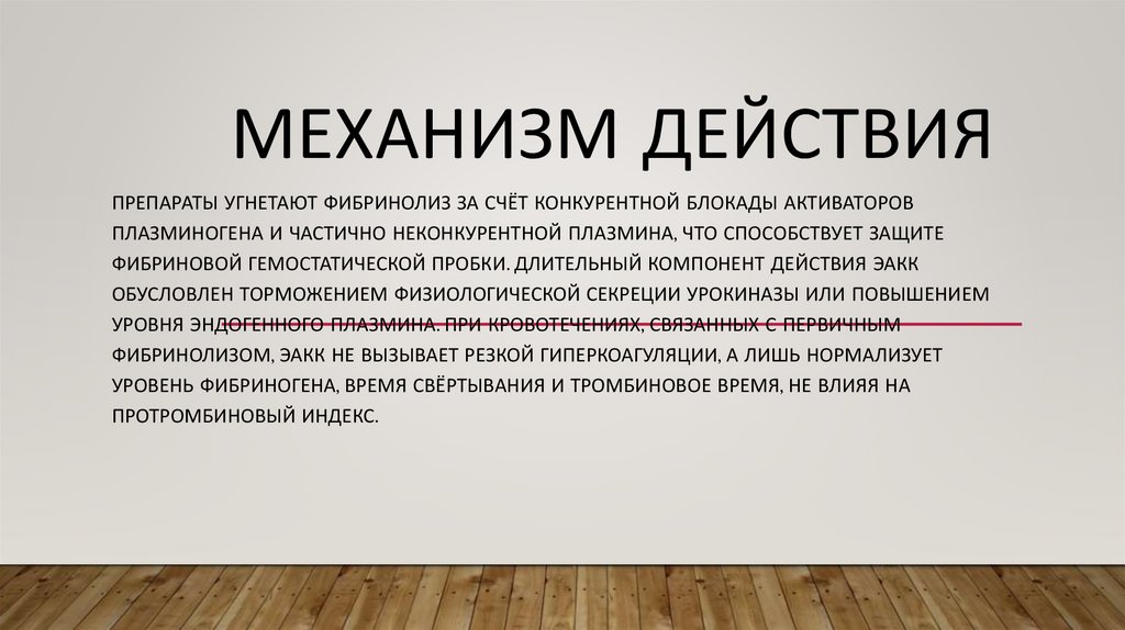 МЕХАНИЗМ ДЕЙСТВИЯПРЕПАРАТЫ УГНЕТАЮТ ФИБРИНОЛИЗ ЗА СЧЁТ КОНКУРЕНТНОЙ БЛОКАДЫ АКТИВАТОРОВ
