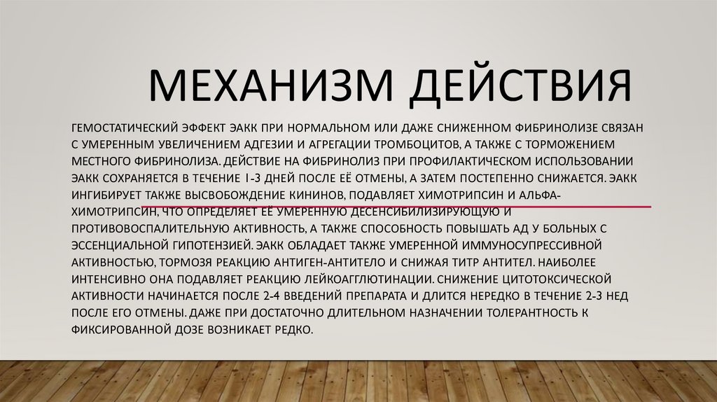 МЕХАНИЗМ ДЕЙСТВИЯГЕМОСТАТИЧЕСКИЙ ЭФФЕКТ ЭАКК ПРИ НОРМАЛЬНОМ ИЛИ ДАЖЕ СНИЖЕННОМ ФИБРИНОЛИЗЕ СВЯЗАН