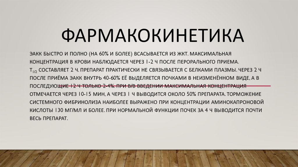 ФАРМАКОКИНЕТИКАЭАКК БЫСТРО И ПОЛНО (НА 60% И БОЛЕЕ) ВСАСЫВАЕТСЯ ИЗ ЖКТ. МАКСИМАЛЬНАЯ