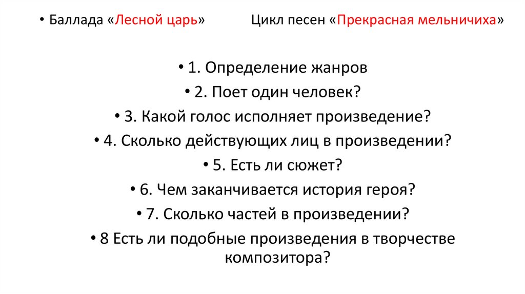 • Баллада «Лесной царь»Цикл песен «Прекрасная мельничиха»