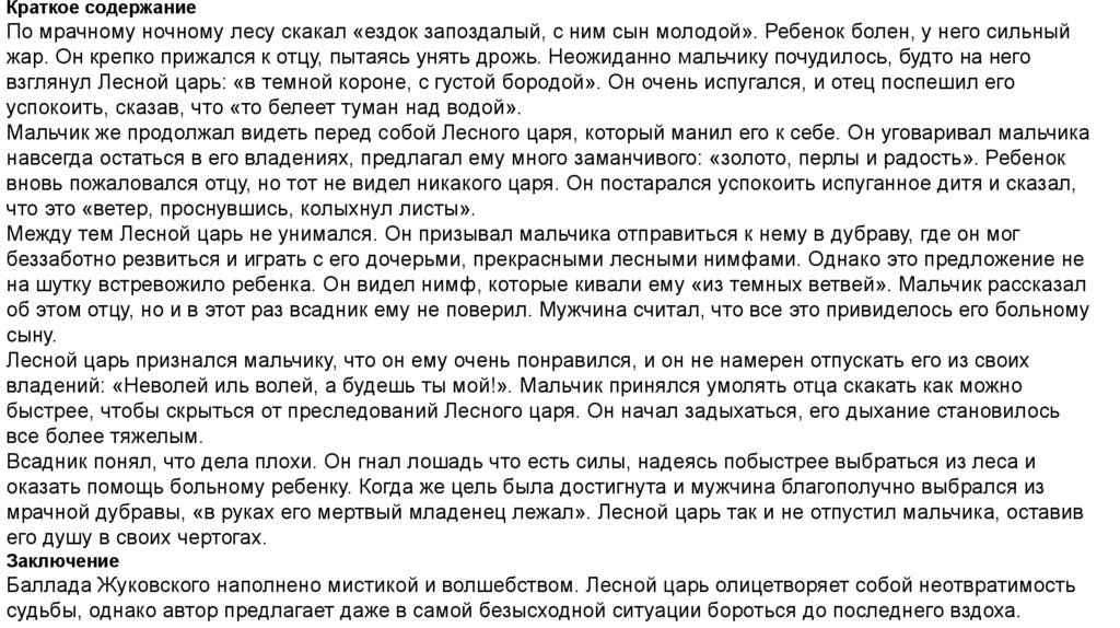 Краткое содержаниеПо мрачному ночному лесу скакал «ездок запоздалый, с ним сын молодой». Ребенок болен, у него сильный