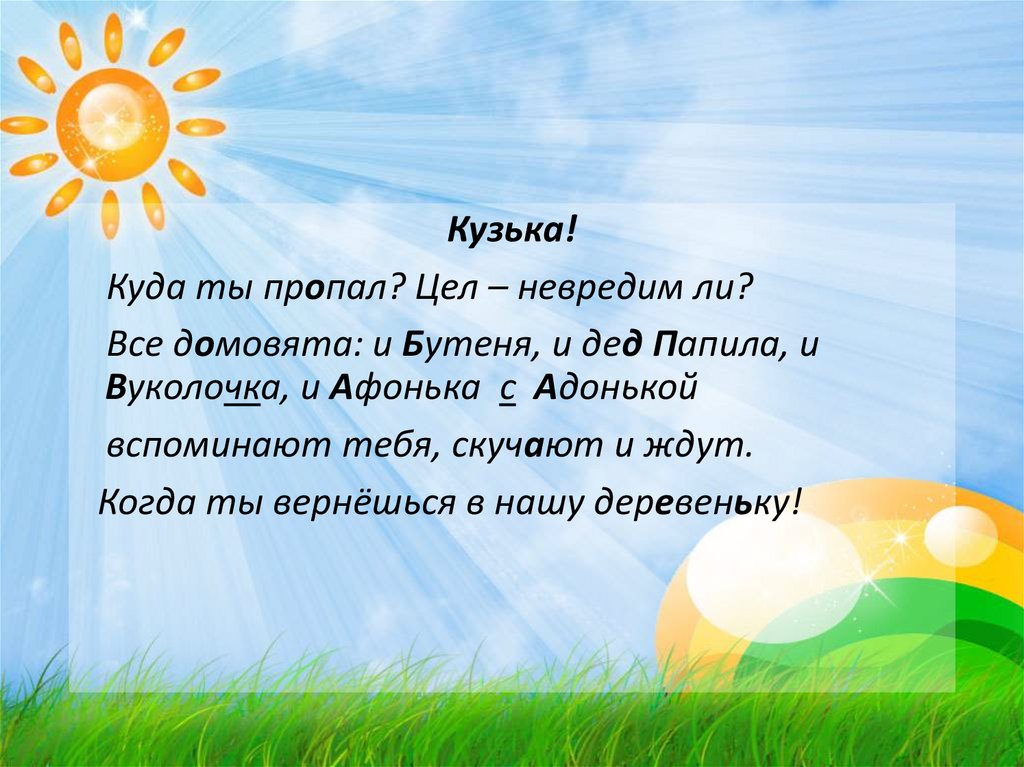 3. Кузька! Куда ты прапал? Цел – невредим ли? Все дамовята: и бутеня, и дет папила, и вуколочька, и афонкасадонькой вспоминают