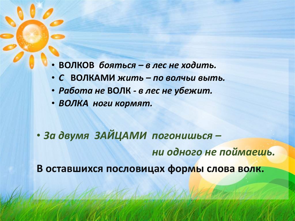 Листок – листик, листочек, лист7. В каких из этих пословиц упоминается не тот, кто в остальных? … бояться – в лес не ходить. С … жить – по волчьи выть. За двумя