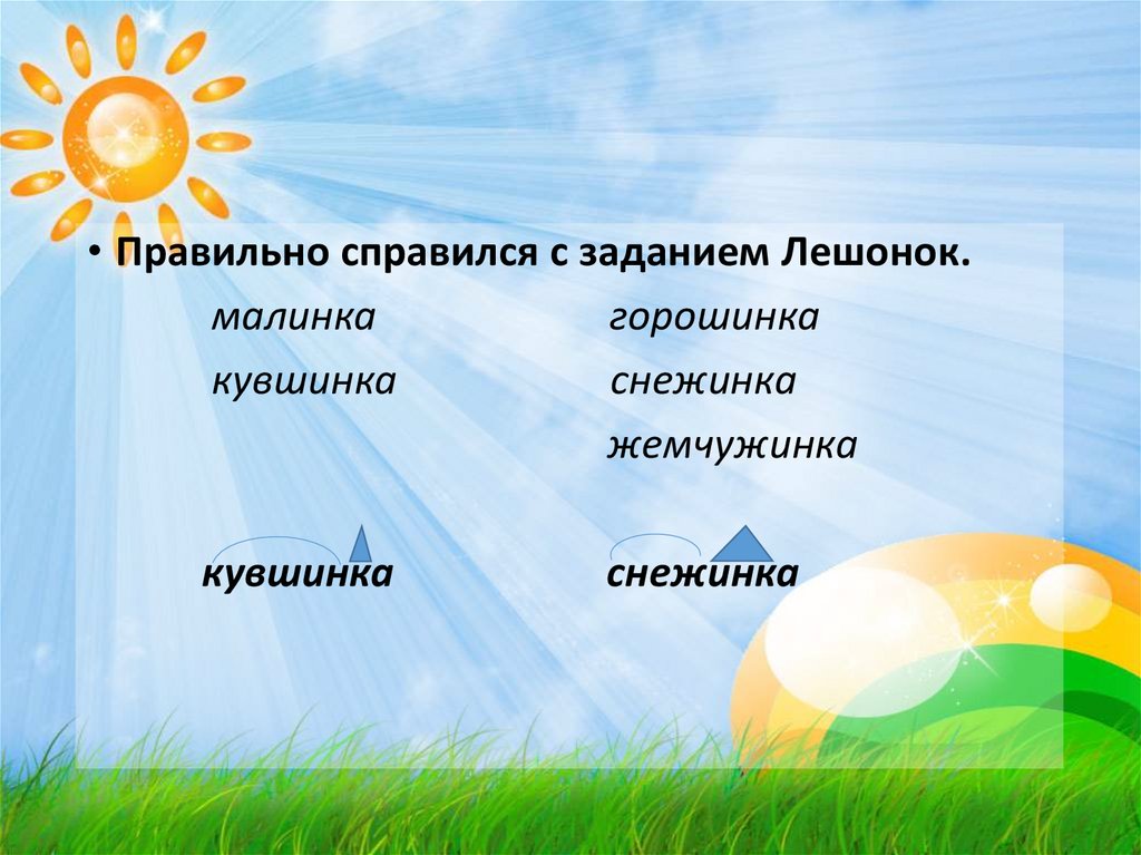 9. Горошинка, кувшинка, жемчужинка, малинка, снежинка.