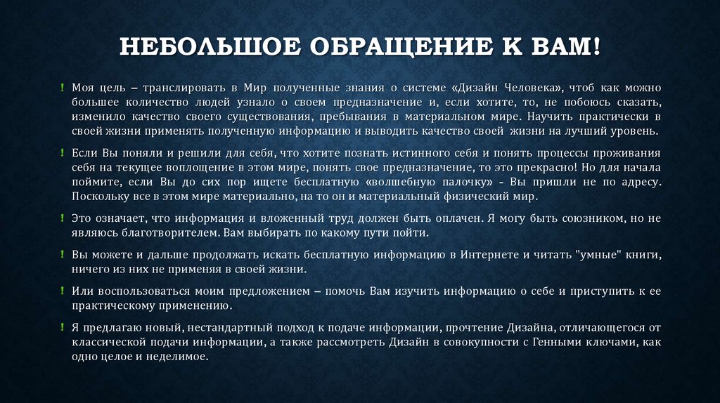 НЕБОЛЬШОЕ ОБРАЩЕНИЕ К ВАМ!Моя цель – транслировать в Мир полученные знания о системе «Дизайн Человека», чтоб как можно