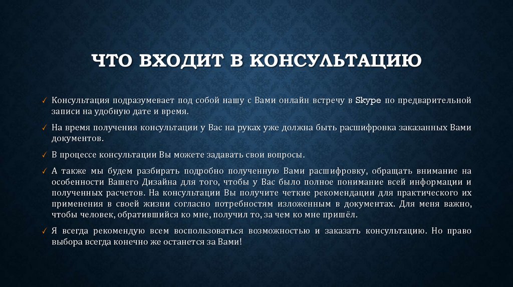 ЧТО ВХОДИТ В КОНСУЛЬТАЦИЮКонсультация подразумевает под собой нашу с Вами онлайн встречу в Skype по предварительной