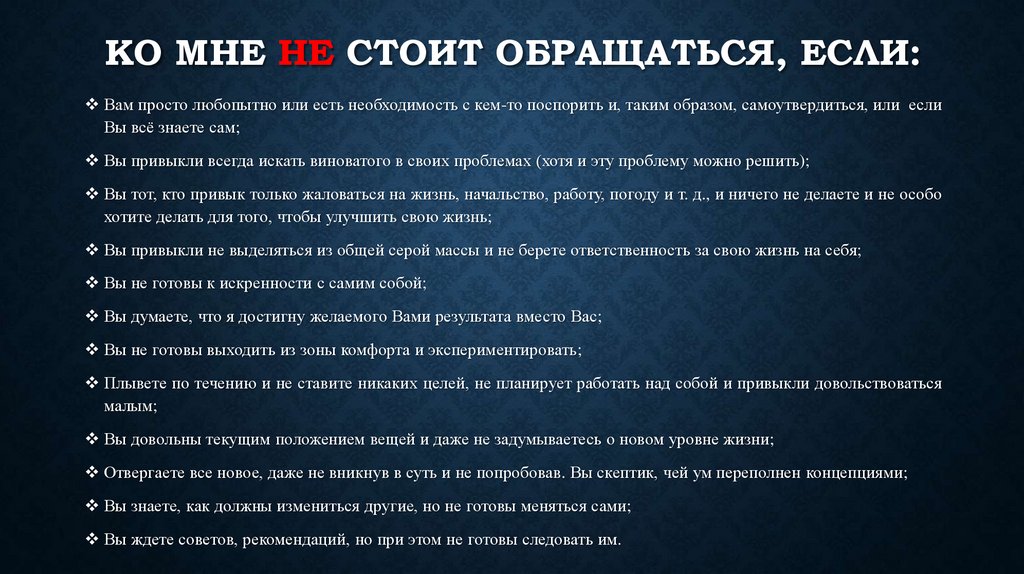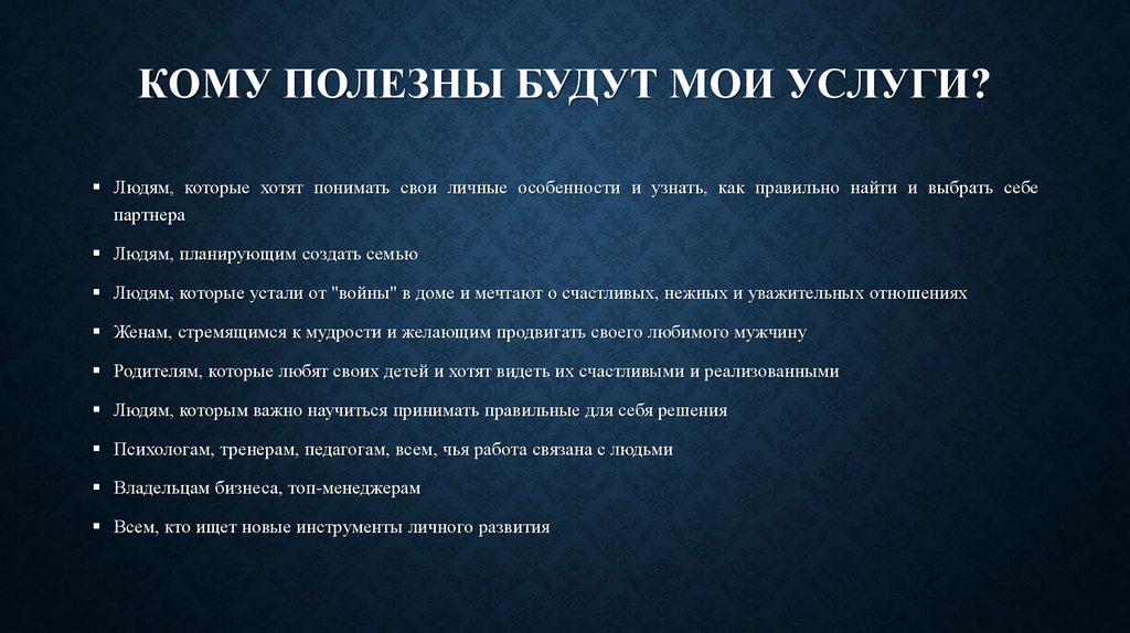 КОМУ ПОЛЕЗНЫ БУДУТ МОИ УСЛУГИ?Людям, которые хотят понимать свои личные особенности и узнать, как правильно найти и выбрать себе