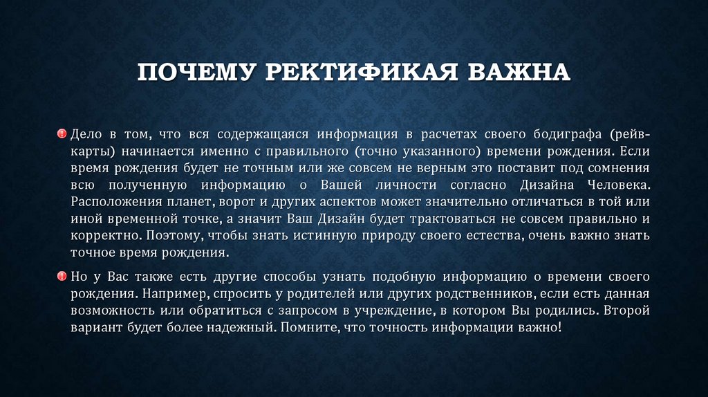 ПОЧЕМУ РЕКТИФИКАЯ ВАЖНАДело в том, что вся содержащаяся информация в расчетах своего бодиграфа (рейвкарты) начинается именно с правильного (точно указанного) времени рождения. Если