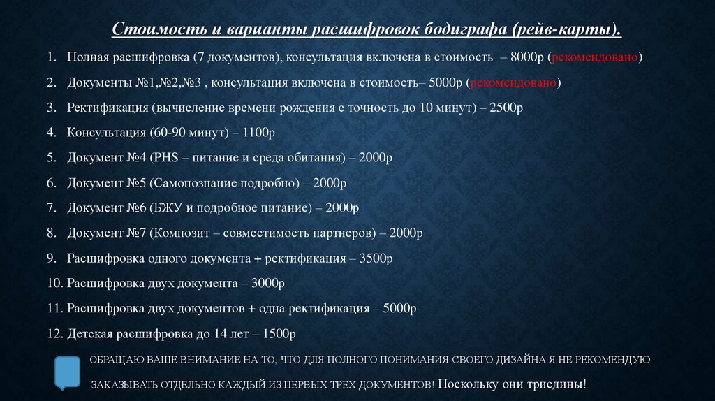 Стоимость и варианты расшифровок бодиграфа (рейв-карты).1. Полная расшифровка (7 документов), консультация включена в стоимость – 8000р (рекомендовано)
